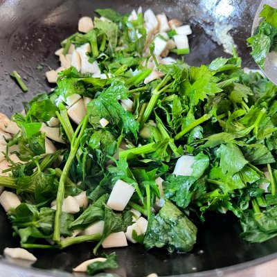 步骤3、放芹菜炒均匀